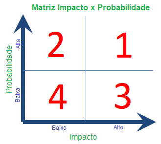A Matriz de Impacto e Probabilidade pode ser feita em um gráfico com quatro quadrantes. Veja a seguir: